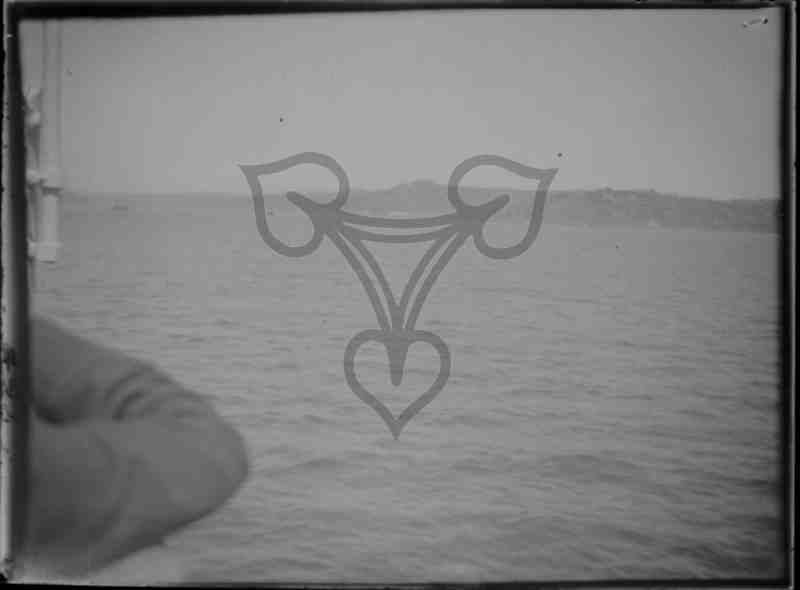 Blick auf den Bosporus, von einem Flussdampfer aus gesehen. Am linken Bildrand die Armbeuge eines Mannes, der an der Reling des Dampfers lehnt.
