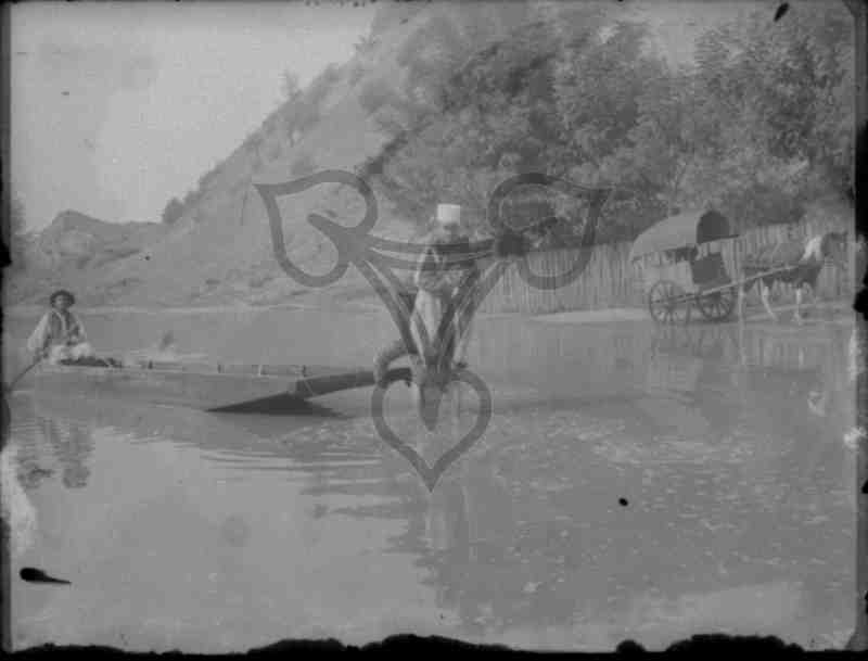 Auf einer knöcheltiefen Wasserfläche schwimmt ein Kahn in dem ein Mann in traditioneller rumänischer Tracht sitzt und ein Ruder in der Hand hält. Barfuß und mich hochgebundener Hose trägt ein zweiter, ebenfalls in Tracht gekleideter Mann, einen Soldaten auf dem Rücken vom Kahn weg. In der oberen Bildhälfte erhebt sich im Hintergrund ein teils bewaldeter Hügel, an dessen Fuße sich in der rechten Bildhälfte ein umzäuntes Grundstück befindet. Zwischen Zaun und Wasserfläche steht ein zweirädriger Einspänner.