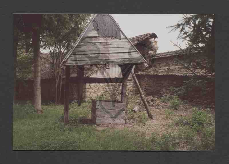 Bildmittig die hölzerne Brunnenleibung aus drei übereinandergeschichteten Brettreihen. Darüber ein im Grundriß quadratisches, in der Form dreieckiges Holzdach auf drei, ehemals vier Pfosten. Die Dachpappe fehlt vollkommen. Dahinter ein an die Wehrmauer angebautes Gebäude, Teile der Wehrmauer, sowie an den beiden Bildrändern Nadelbäume.