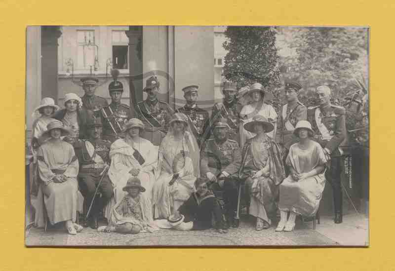 In zwei Reihen, stehend und davor sitzend, sind die Mitglieder der königlichen Familie leicht halbkreisförmig gruppiert, die Männer in Uniform, die Damen überwiegend in hellen Kleidern.