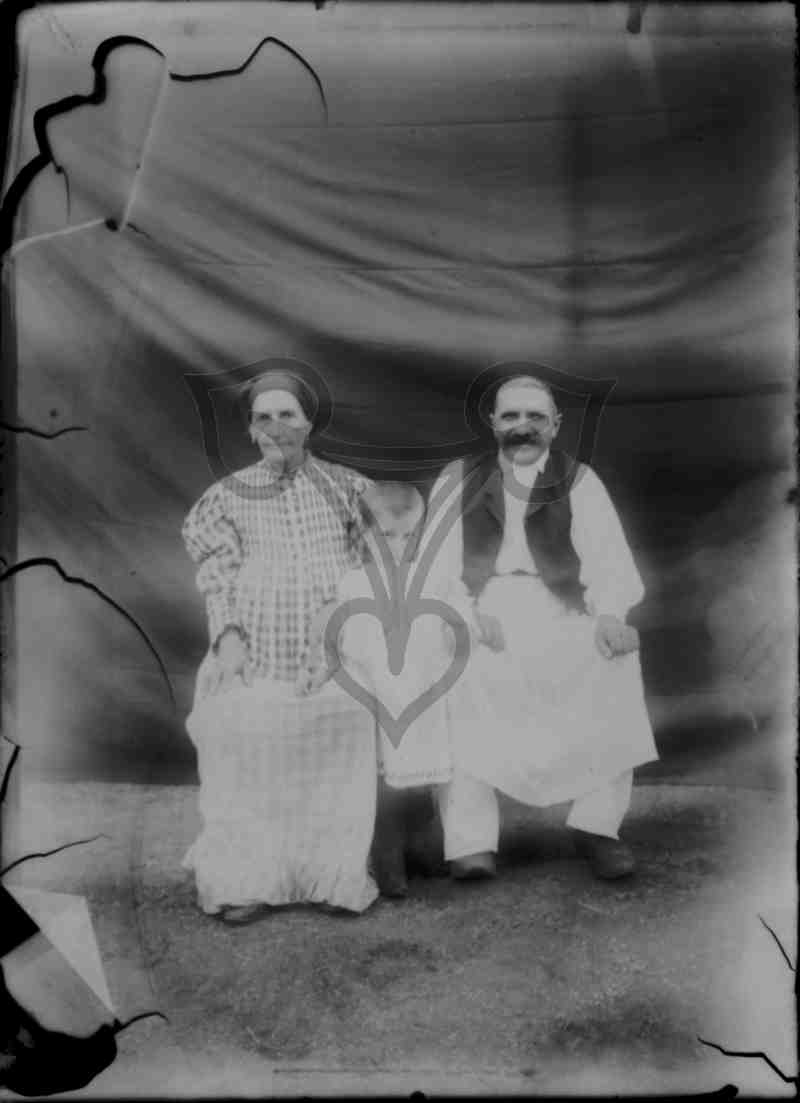 Vor einem aufgespannten schwarzen Tuch sitzt ein älteres Ehepaar auf zwei Stühlen im Freien. Zwischen den beiden steht ein Kind. Alle drei blicken in die Kamera.