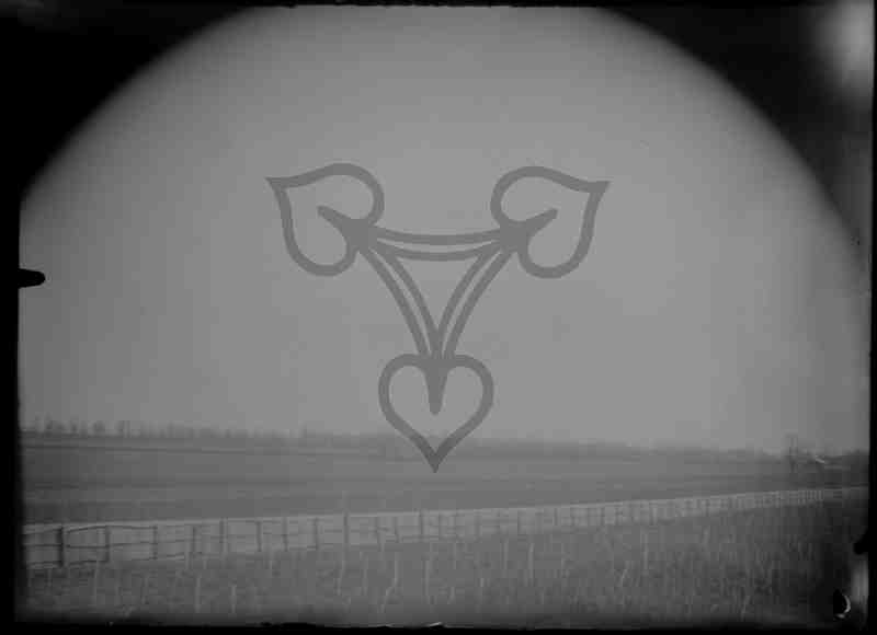 Blick über Felder. Am unteren Bildrand verläuft ein dichter Holzzaun, am linken Bildrand unten sind zwei Holzhütten zu erkennen.