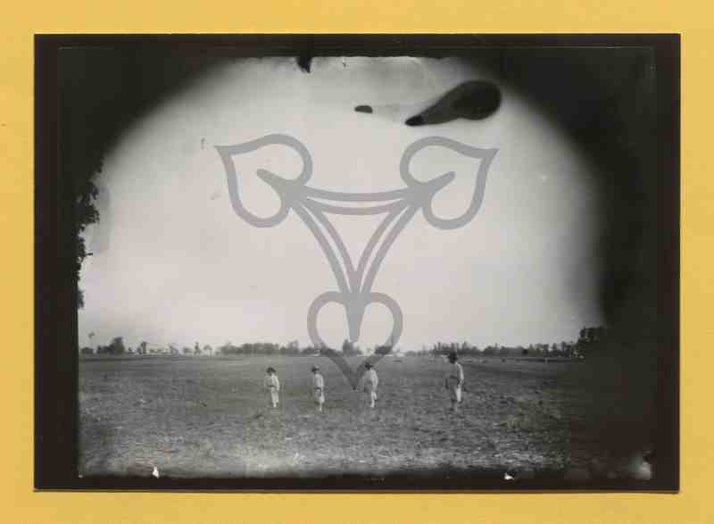 Blick über Felder. Am unteren Bildrand vier mit Abstand nebeneinander stehende Tracht tragende Männer zu erkennen.