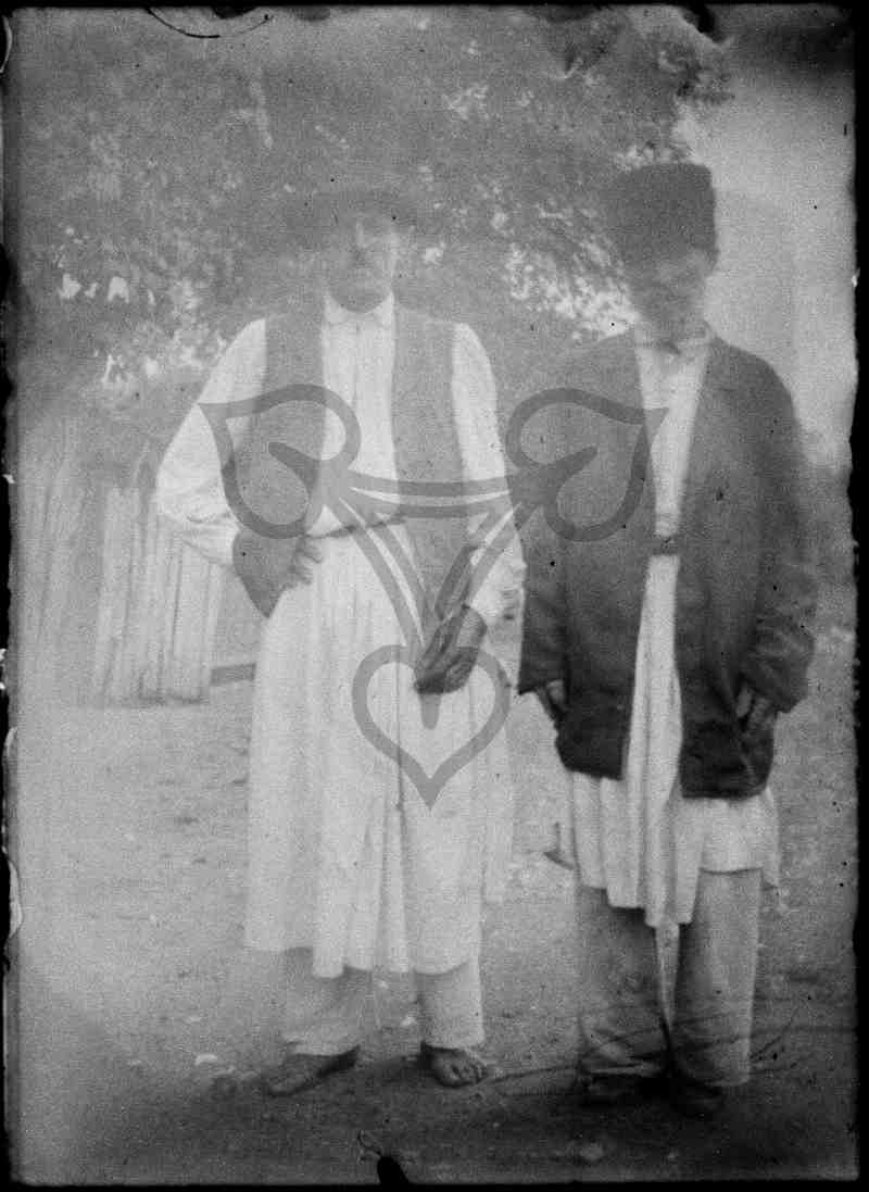 Zwei Tracht tragende Männer in Garten stehen nebeneinander und blicken in die Kamera. Im Hintergrund ein Holzzaun aus senkrechten Latten, dahinter Bäume.