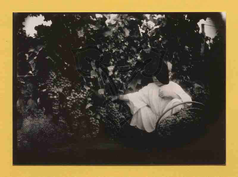 Trauben erntender Junge. Vor einem Weinstock sitzt ein Tracht tragender Junge und pflückt Weintrauben in einen Korb.