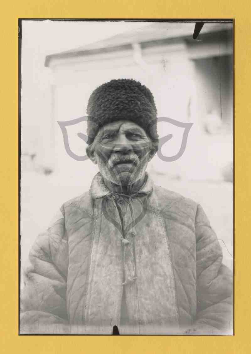 Halbbrustporträt des im Freien stehenden älteren Mannes. Er trägt den typischen dicken Mantel der rumänischen Arbeitstracht aus Schafspelz sowie eine schwarze Pelzmütze.