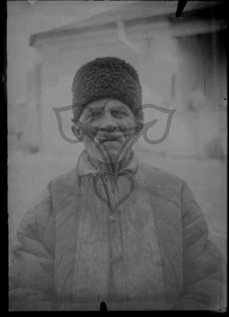 Halbbrustporträt des im Freien stehenden älteren Mannes. Er trägt den typischen dicken Mantel der rumänischen Arbeitstracht aus Schafspelz sowie eine schwarze Pelzmütze.