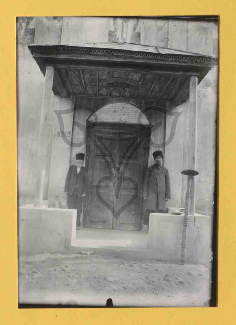 Details: Intrarea in biserica Sf. Nicolae. La dreapta e preotul Gh. Stefaniu ("popa Nae"), ca 50 ani. La stînga Cîntărețul Gh. P. Dioșteanu ("Ciucu", "Logofătu Gheorghe") 78-79 ani