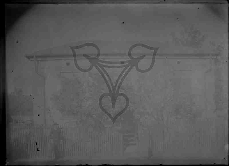Außenansicht des Wohnhauses von der gegenüber liegenden Straßenseite aufgenommen. Vor dem Holzzaun aus senkrechten Latten steht ein in schwarz gekleideter Mann, vermutlich der Eigentümer.