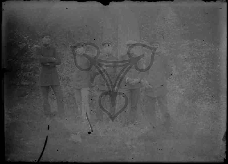 Auf einer Grünfläche vor Bäumen steht eine Gruppe von fünf jungen Männern in Schuluniform.