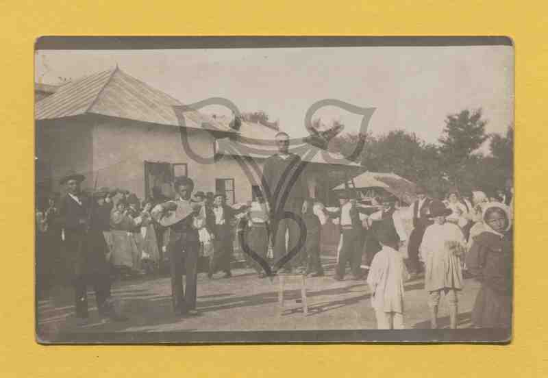 Auf einer Freifläche steht bildmittig ein Mann auf einem Hocker, links neben ihm ein Geigen- und ein Mandolinen(?)-Spieler, im Hintergrund rechts tanzende Männer, die sich gegenseitig die Arme auf die Schultern gelegt haben. Am linken und rechten Bildrand Zuschauer, dahinter links ein größeres Gebäude. Viele Personen tragen die typisch rumänische Bauerntracht.