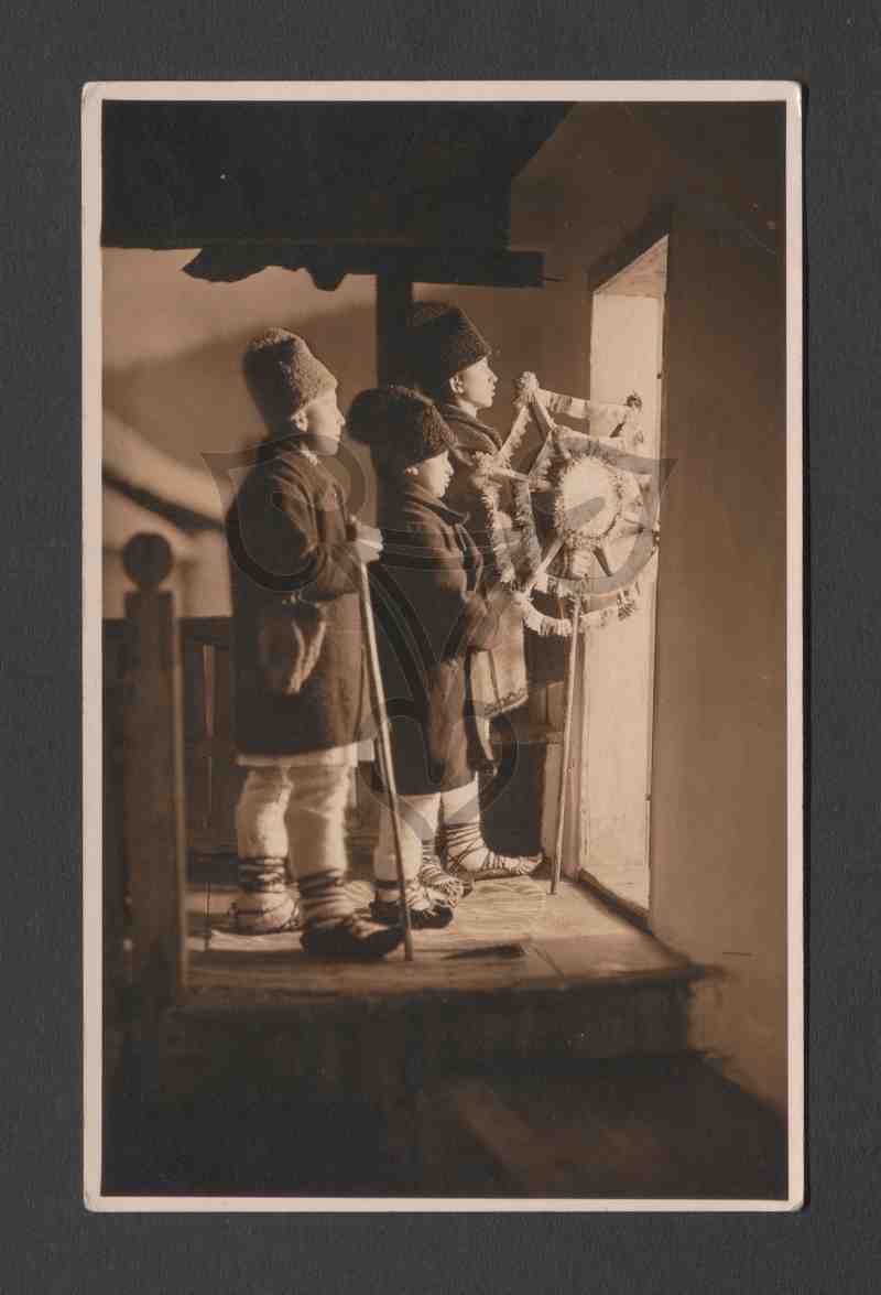 Drei Jungen stehen auf der hölzernen Veranda vor der erleuchteten Eingangstüre eines Hauses. Derjenige, der der Türe am nächsten steht, hält einen Weihnachtsstern in der Hand. Alle drei tragen sie die typische rumänische Bauerntracht. Das Bild stellt den Brauch des ‚Colindat‘ dar, das am Heiligabend von Haus zu Haus herumziehender junger, traditionell unverheirateter Männer, um festliche Lieder (Colinde) zu singen.