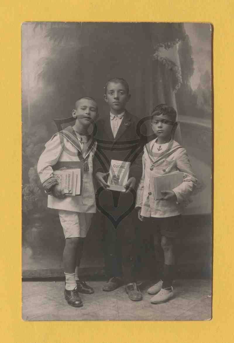 Studioaufnahme, gemalter Hintergrund. Die Jungen stehen nebeneinander, halten Bücher in den Händen und blicken in die Kamera.