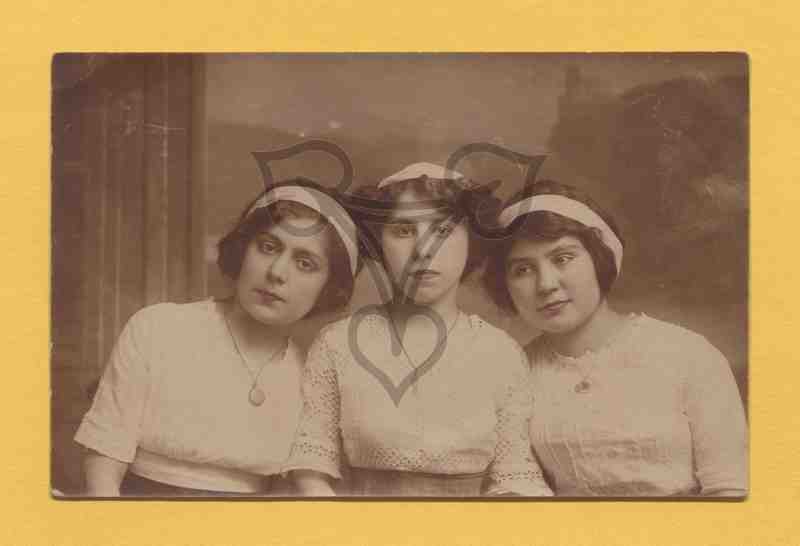 Studioaufnahme, bemalter Hintergrund. Die drei Mädchen sitzen nebeneinander. Alle drei tragen weiße Blusen und eine weiße Kopfbedeckung. Die beiden äußeren haben die Köpfe der mittleren zugeneigt, die beiden linken blicken in die Kamera, die rechte links an der Kamera vorbei. Ihre Lippen sind von Hand rot koloriert.