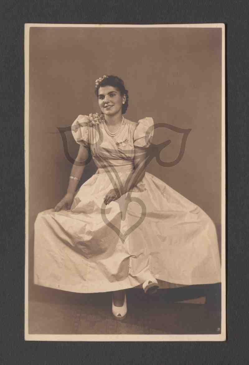 Studioaufnahme, neutraler Hintergrund. Die Frau sitzt mit einem hellen Kleid bekleidet zur Kamera gewandt und blickt links an dieser vorbei.