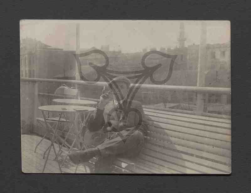 Ein Mann der Reisegruppe, vermutlich auf einer Fähre im Bosporus bei Istanbul, sitzt auf einer Bank, hat das linke über das rechte Bein geschlagen und hält mit der rechten Hand eine Pfeife im Mund. Er trägt einen dunklen Anzug, Hemd und Krawatte und blickt in die Kamera. Links neben ihm stehen ein Klapptisch und dahinter ein Klappstuhl. Im Hintergrund die Gebäudesilhouette mit islamischer Architektur und eines Minaretts.