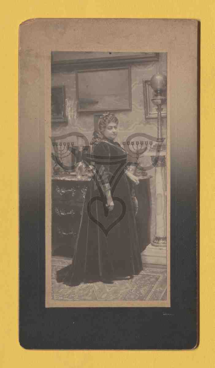 Vor einer mit Gemälden reich dekorierten Wand steht eine schwarz gekleidet Frau nach rechts gewandt und blickt an der Kamera vorbei. Sie stützt sich mit der linken Hand an einer hinter ihr stehenden Kommode ab, auf der zwei Menora, eine Blumenvase, ein Bildrahmen sowie weitere Gegenstände stehen.