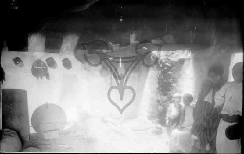 Innenansicht in den Raum einer Erdhütte. An der linken Wand hängen Krüge unter den Dachbalken. Auf gleicher Höhe ist Bildmittig in der Ecke des Raumes eine Ablage aus Bohlen gebaut, auf der überwiegend tönernes Geschirr abgelegt ist. Weitere Gerätschaften und Habseligkeiten stehen in der linken unteren Bildecke, teils an die Wand gelehnt, teils auf dem Boden abgestellt. Bildmittig rechts befindet sich ein Fenster, durch das helles Licht in den sonst unbeleuchteten Raum dringt und die rechte Raumecke und den Boden blendend erhält. Rechts unterhalb des Fenster sind zwei Kinder zu erkennen, ein kleiner Junge stehend sowie ein etwas älterer sitzend. Am rechten Bildrand, in dem angeschnittenen offenen Türrahmen steht ein erwachsenes Paar.