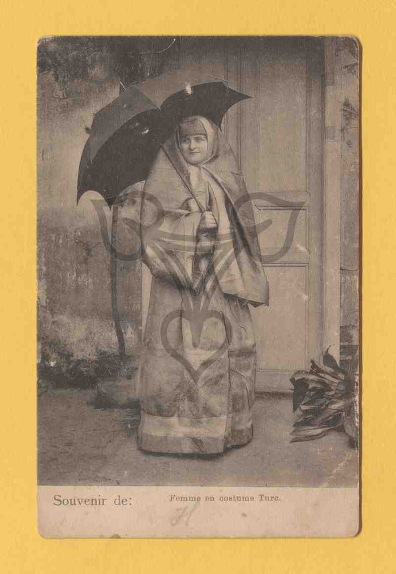 Studioaufnahme, gemalter Hintergrund. Die Tracht tragende Frau hält einen schwarzen Regenschirm über der rechten Schulter, ist nach links gewandt und blickt an der Kamera vorbei.