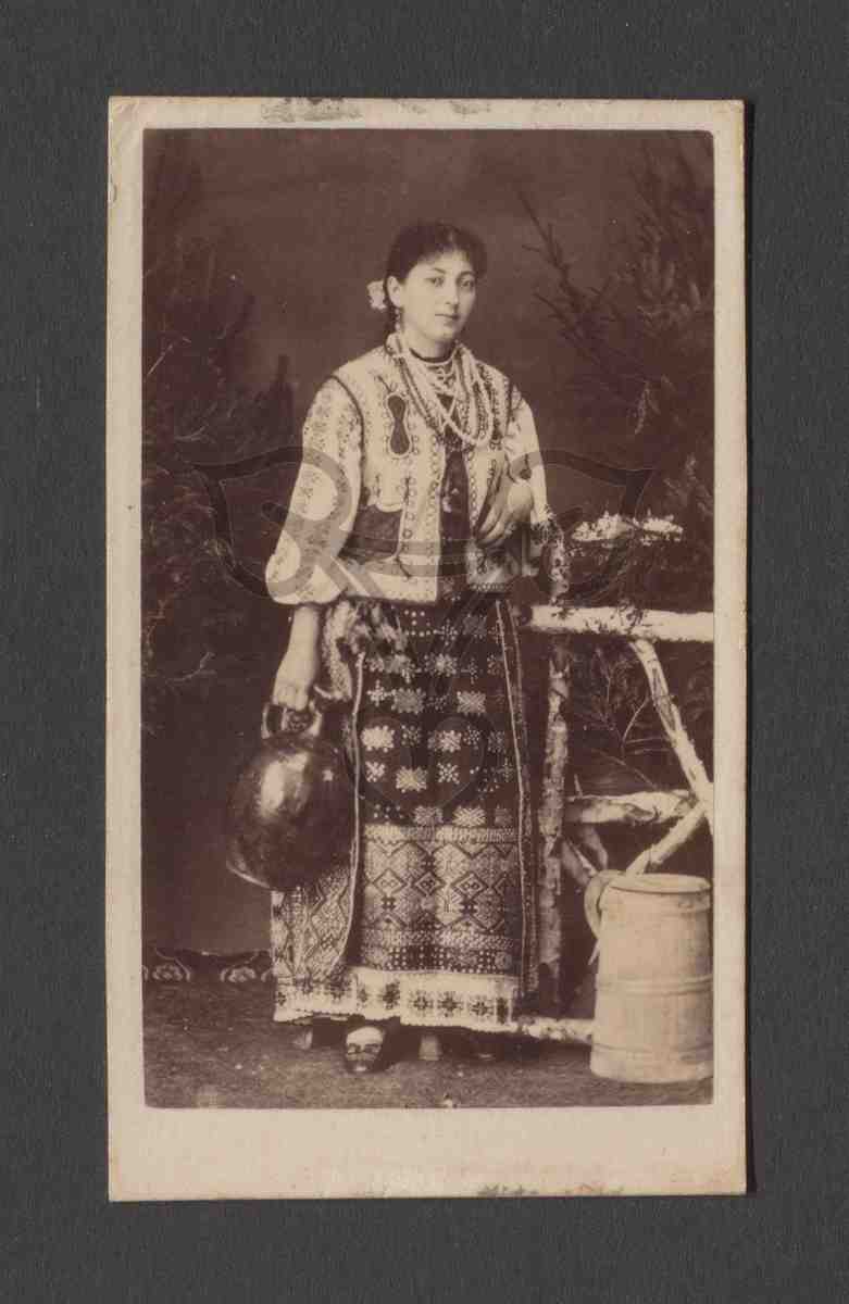 Studioaufnahme, gemalter Hintergrund. Die Tracht tragende Frau steht vor einer hölzernen Zaunattrappe nach rechts gewandt, hält in der rechten Hand einen Tonkrug und blickt in die Kamera. Rechts von ihr steht ein hölzernes Butterfass.