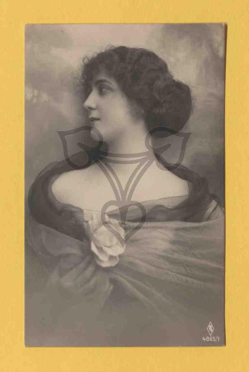Studioaufnahme, gemalter Hintergrund. Halbbrustporträt einer jungen Frau. In der unteren rechten Ecke das Signet des Verlages: PFB 4865/1.