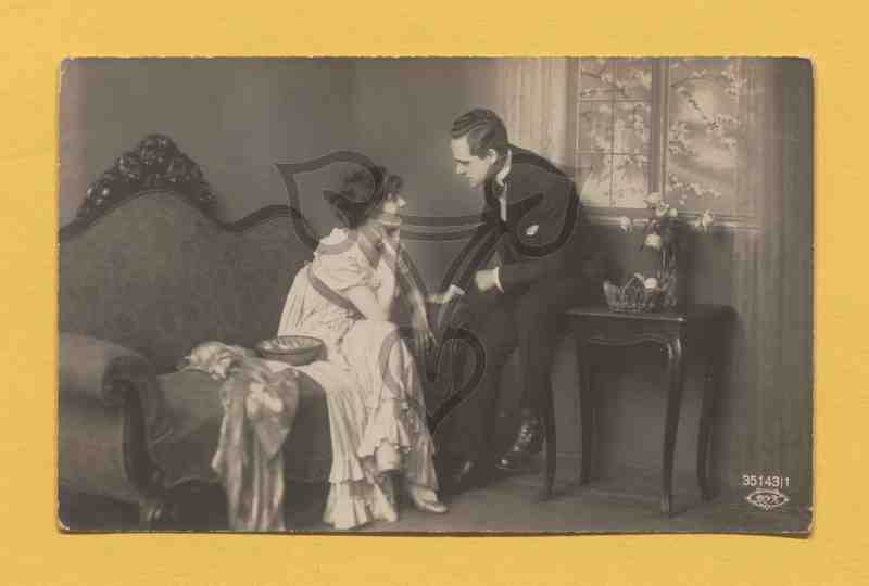 Ein junges Paar in trauter Zweisamkeit in einem Raum. Sie sitzt auf einer Chaiselongue, er auf einem im 90 Grad dazu gestellten Beistelltisch und stützt sich mit dem rechten Arm auf der Lehne des Sofas ab. In der unteren rechten Ecke das nicht entzifferbare Signet des Verlages.
