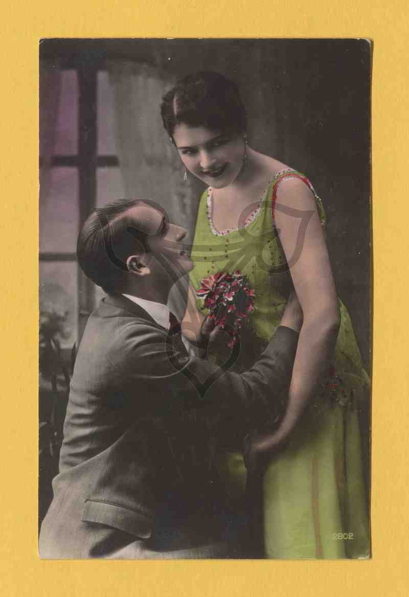 Studioaufnahme, gemalter Hintergrund. Ein Mann in schwarzem Anzug sitzt auf einem Stuhl und hält eine Frau in geschmückten grünen Kleid, die sich mit der linken Hand auf der Stuhllehne abstützt und in der rechten einen roten Blumenstrauß hält, an den Hüften fest.