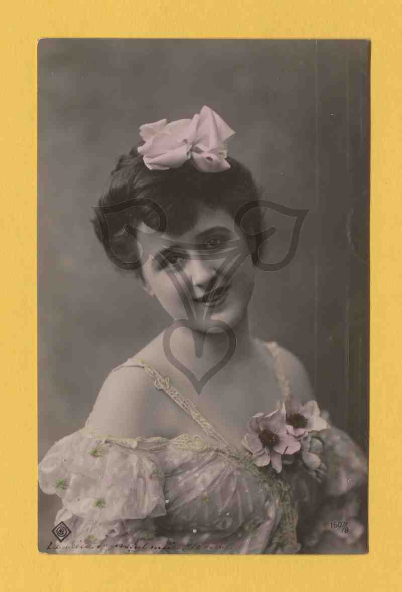 Studioaufnahme, gemalter Hintergrund. Leicht bekleidete junge Frau mit rosafarbenen Blumen im Haar und Dekolleté. In der unteren linken und rechten Ecke das Signet des Verlages: PG 1607/8.