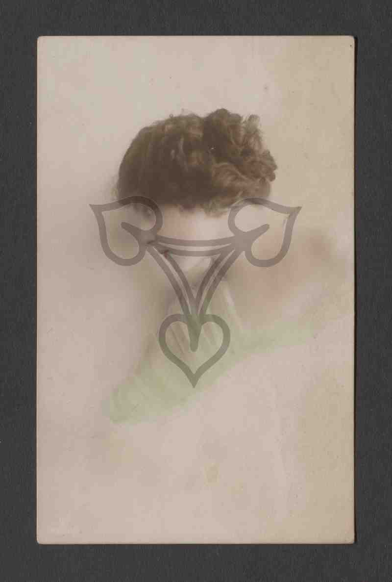 Studioaufnahme, neutraler Hintergrund. Halbbrustporträt einer nach links unten blickenden jungen Frau in lindgrünem Kleid und braunem Haar.