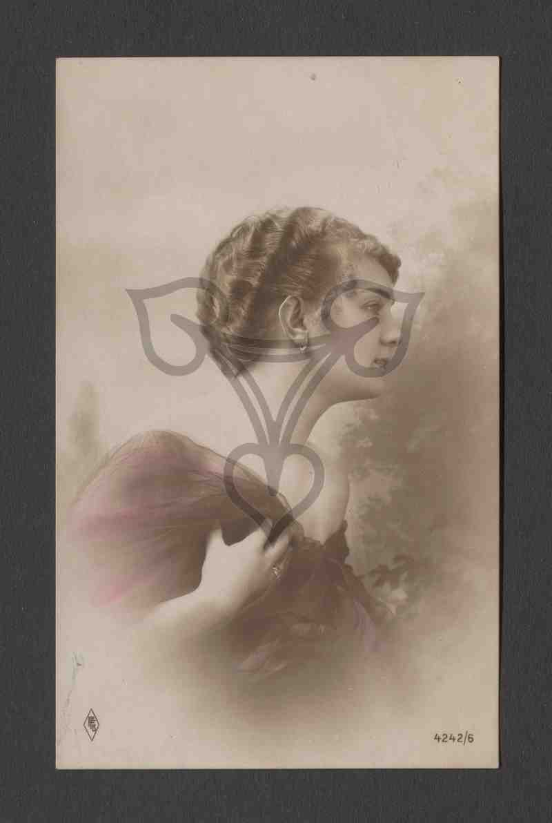 Studioaufnahme, gemalter Hintergrund. Junge Frau trägt ein schulterfreies Kleid, ist nach rechts gewandt und blickt an der Kamera vorbei. In der unteren linken und rechten Ecke das Signet des Verlages: PFB 4242/6.