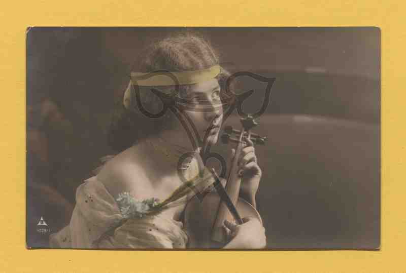 Studioaufnahme, neutraler Hintergrund. Junge Frau hält träumend eine Geige in der Hand. In der unteren linken Ecke das nicht entzifferbare Signet des Verlages.