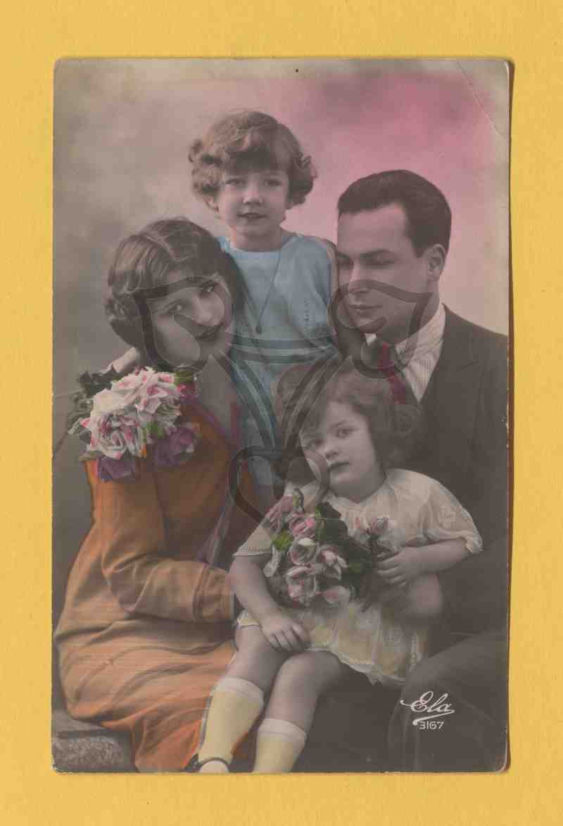Studioaufnahme, neutraler Hintergrund. Ein junges Paar mit zwei Töchtern. In der unteren rechten Ecke das Signet des Verlages: Ela 3167.