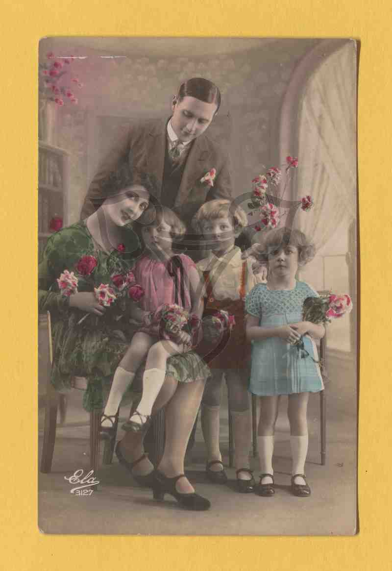Studioaufnahme, neutraler Hintergrund. Ein junges Paar mit zwei Töchtern und einem Sohn. In der unteren linken Ecke das Signet des Verlages: Ela 3127.