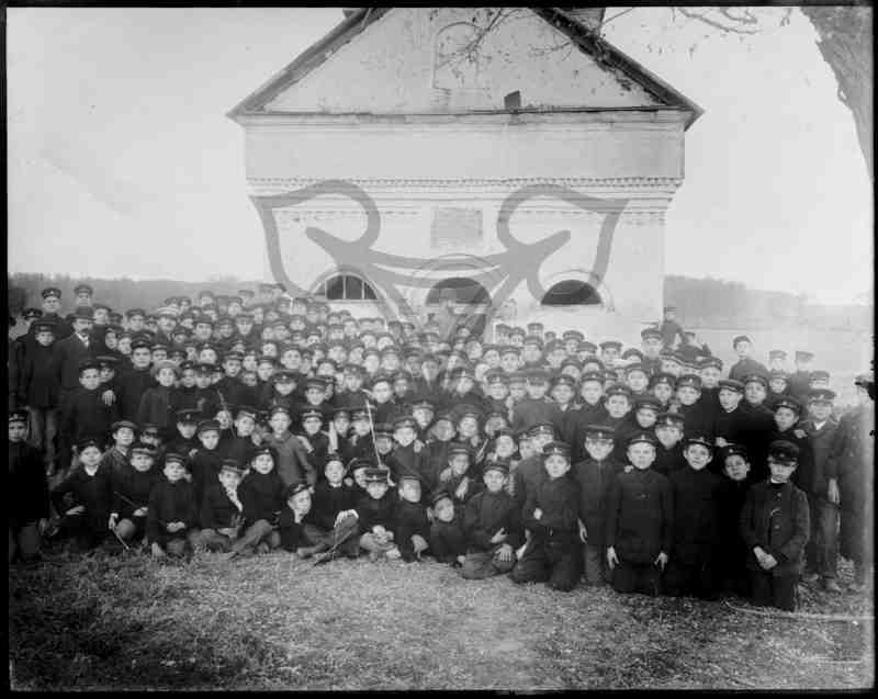 Uniformierte Schüler posieren in mehreren Reihen sitzend und stehend hintereinander. Vor der Kircheneingang ein lesender Erwachsener in hellem Mantel und dunklem Hut.