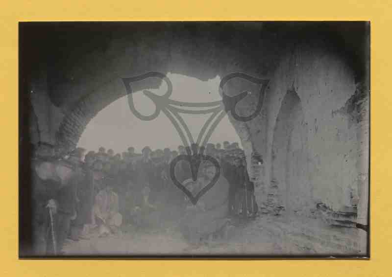 Gruppenfoto einer Reisegruppe in einer Bauruine mit Gewölbebögen.