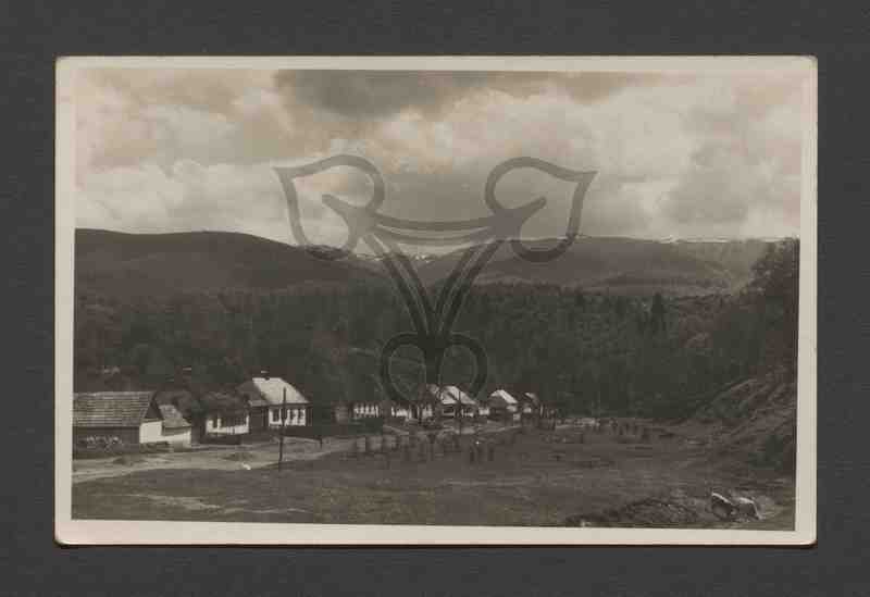 Blick auf eine zwischen sanften, teils bewaldeten Hügeln liegende Häuserzeile entlang eines unbefestigten Weges (Straßendorf?). Vor der Dorfstraße(?) steht eine Reihe Strommasten, in der unteren rechten Ecke stehen zwei Kühe in einer Senke, in der oberen Bildhälfte bewölkter Himmel.