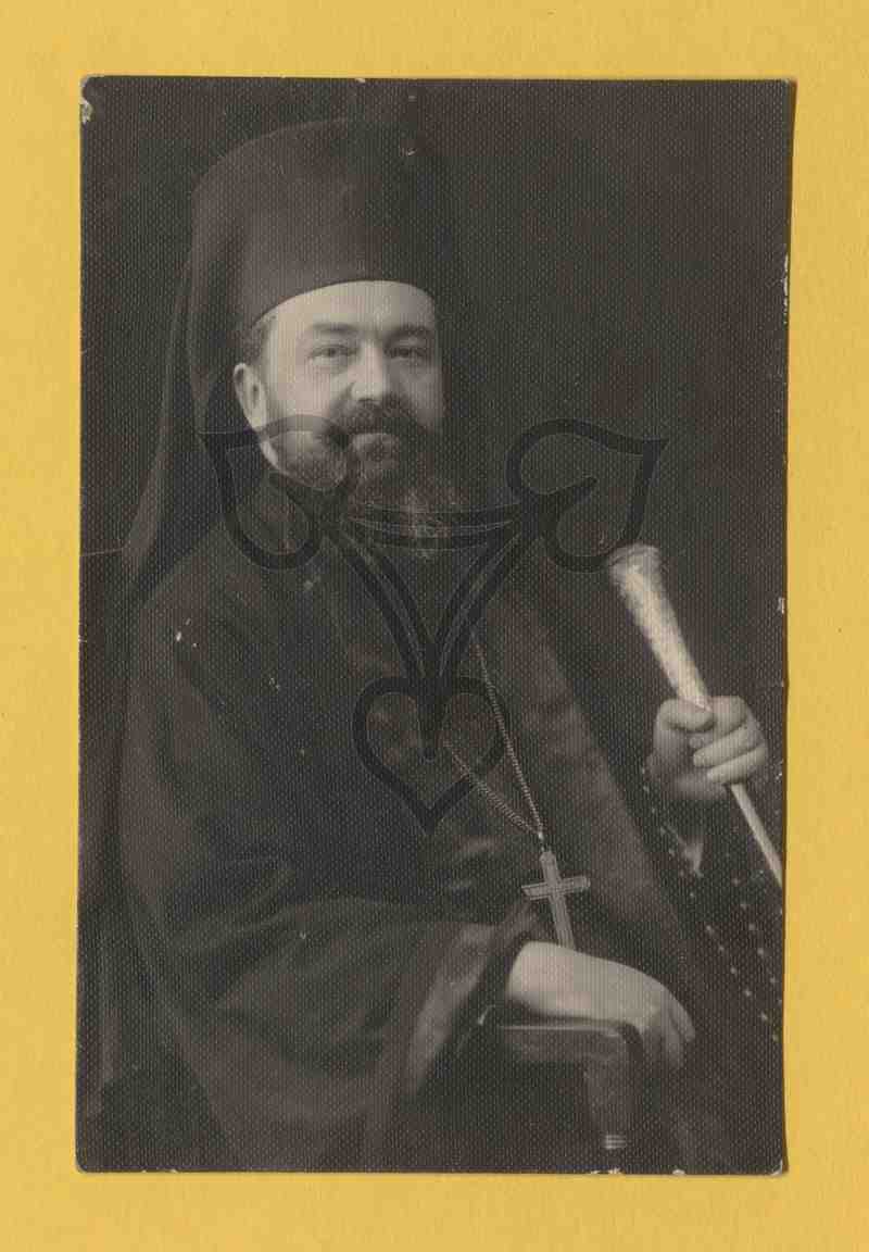 Der orthodoxe Bischof sitzt nach rechts gewandt auf einem Stuhl, trägt Talar, hält einen Bischofsstab in der Hand und blickt in die Kamera.