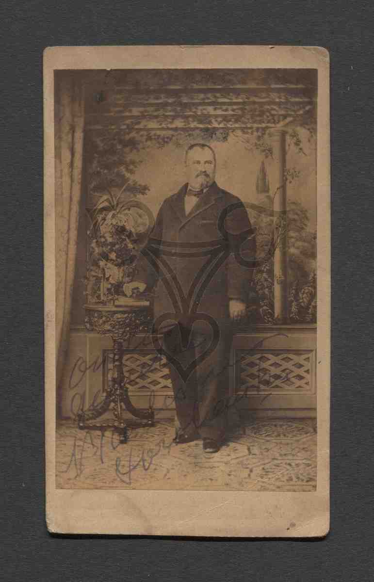 Studioaufnahme, gemalter Hintergrund. Der Mann steht aufrecht nach links gewandt, trägt einen schwarzen Anzug mit weißem Hemd und schwarzer Fliege, stützt sich mit der rechten Hand auf einem Stapel Bücher ab, der auf einem Bestelltisch liegt, und blickt nach rechts an der Kamera vorbei.