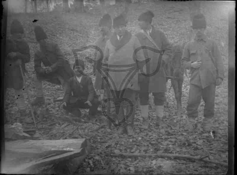 Eine Gruppe Männer steht im Wald. Die meisten tragen die weißen oder grauen Hosen der rumänischen Bauerntracht, Opanken (Opinchen), graue Mäntel oder Jacken und Stoff- oder Fellmützen. Der Mann im Bildmittelpunkt trägt Lederstiefel, dunkle Hose, eine graue Jacke sowie eine Fellmütze. In der rechten Hand hält er ein Jagdgewehr mit dem Lauf zum Boden. Der Mann ganz links stützt sich auf einen Holzstab, der Mann rechts daneben ist diesem Zugewandt und stützt sich auf seinen rechten Oberschenkel. Der dritte Mann von links hockt am Boden. Hinter den Männern rechts steht ein Maulesel.