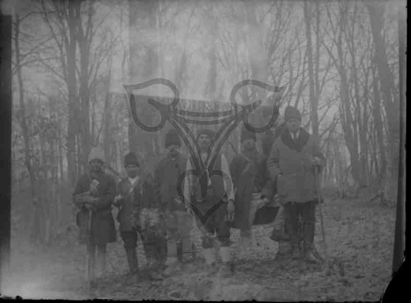 Eine Gruppe Männer steht im Wald. Die meisten tragen die weißen oder grauen Hosen der rumänischen Bauerntracht, Opanken (Opinchen), graue Mäntel oder Jacken und Stoff- oder Fellmützen. Der Mann ganz rechte trägt Lederstiefel, dunkle Hose, eine graue Jacke sowie eine Fellmütze. In der linken Hand hält er einen Wander- oder Treiberstab.