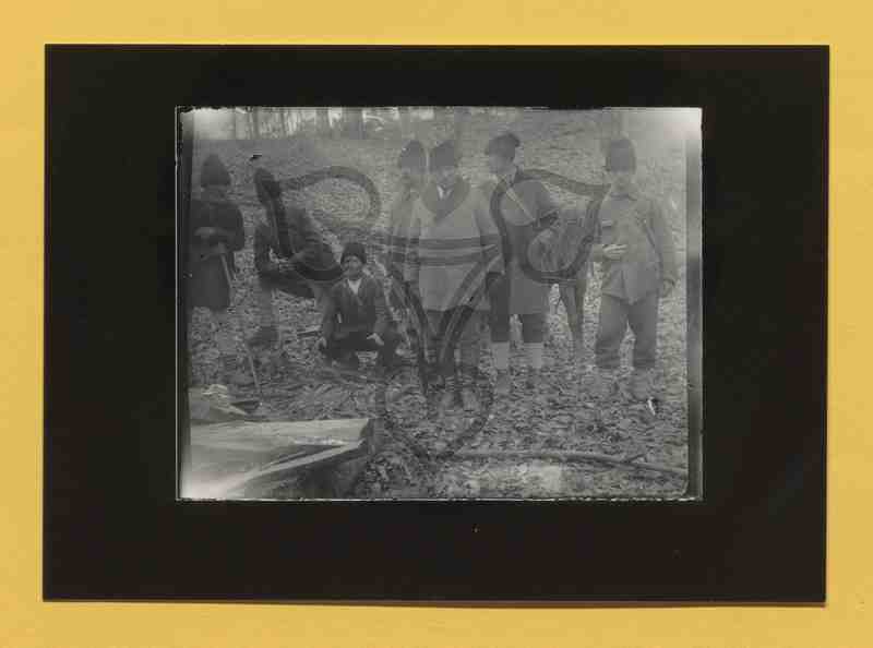 Eine Gruppe Männer steht im Wald. Die meisten tragen die weißen oder grauen Hosen der rumänischen Bauerntracht, Opanken (Opinchen), graue Mäntel oder Jacken und Stoff- oder Fellmützen. Der Mann im Bildmittelpunkt trägt Lederstiefel, dunkle Hose, eine graue Jacke sowie eine Fellmütze. In der rechten Hand hält er ein Jagdgewehr mit dem Lauf zum Boden. Der Mann ganz links stützt sich auf einen Holzstab, der Mann rechts daneben ist diesem Zugewandt und stützt sich auf seinen rechten Oberschenkel. Der dritte Mann von links hockt am Boden. Hinter den Männern rechts steht ein Maulesel.