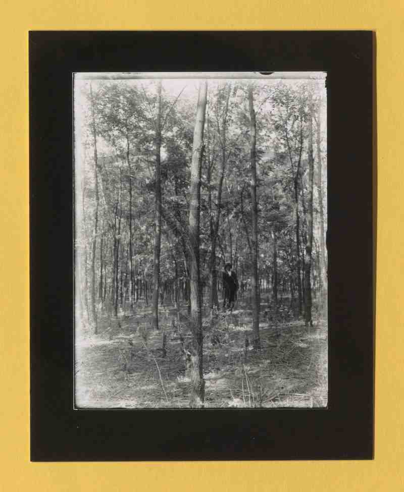 Ein Mann steht im Wald auf ein Gewehr gestützt. Er trägt einen schwarzen Anzug, ein weißes Hemd und einen schwarzen Hut.