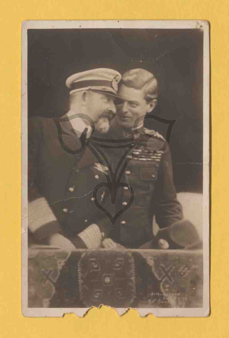 Beide Regenten sind in Uniform gekleidet, stehen hinter einem Tisch(?) nebeneinander und unterhalten sich. Nagetierfraß am unteren Bildrand.