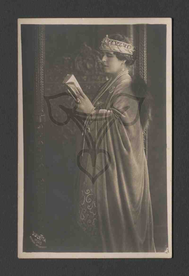Die Königin steht aufrecht nach links gewandt, ist in einen dunklen Umhang gekleidet, trägt eine Krone und hält ein Buch in der Hand in dem sie liest. In der unteren linken Ecke der Werbestempel des Fotografen.
