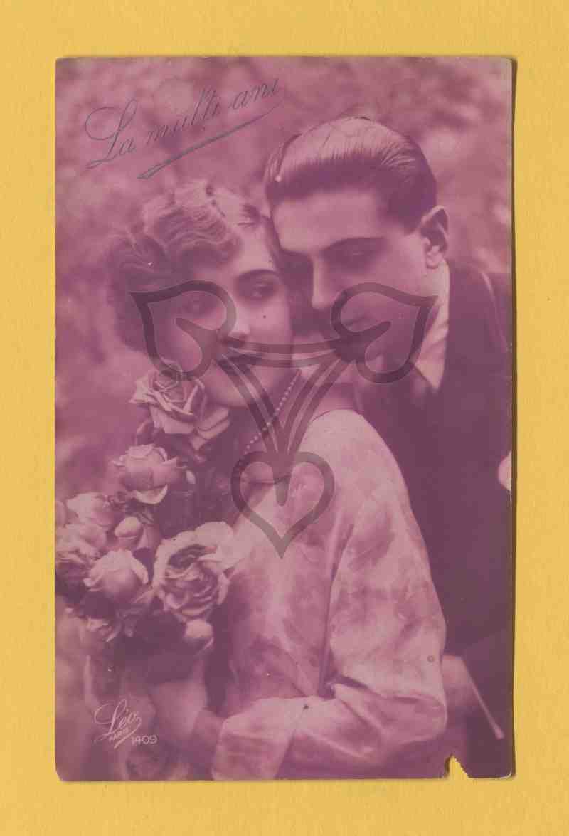 Junges Paar mit Blumenstrauß. In der unteren linken Ecke das Signet des Verlages: Léo Paris 1409.