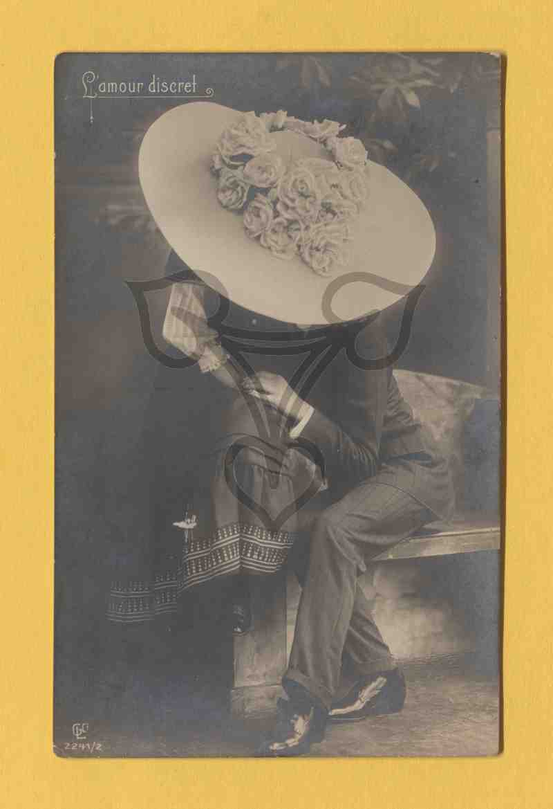 Grußkarte. Auf einer Bank sitzendes, sich scheinbar küssendes Paar. Die Frau trägt einen mit Blumen geschmückten Hut mit überbreiter Krempe, der das Geschehen darunter verbirgt. In der unteren linken Ecke das Signet des Verlages: GLC 2241/2.