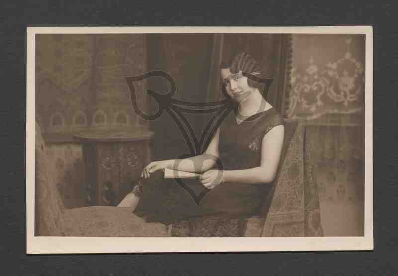Studioaufnahme, Teppiche als Hintergrund. Die Frau sitzt auf einem mit einer stark gemusterten Decke (oder einem Teppich) bedecktem Stuhl, trägt ein dunkles Kleid, ist nach links gewandt und blickt in die Kamera.
