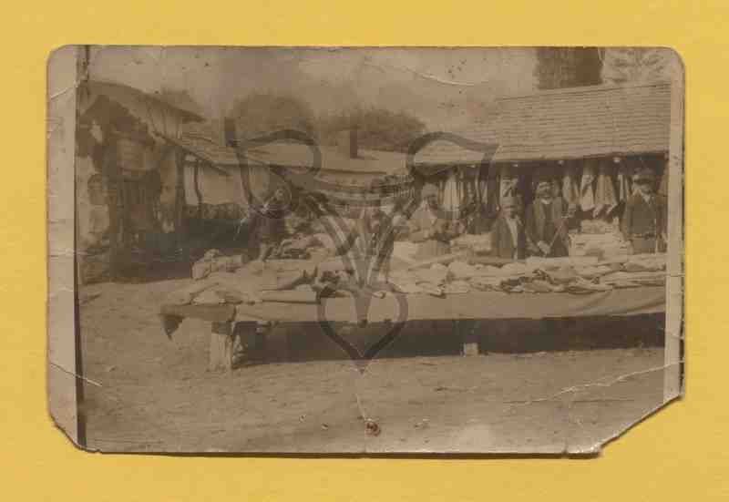Auf einem provisorischen Tisch haben Händler ihre Tuchware ausgebreitet. Hinter dem Tisch stehen mehrere Personen beiderlei Geschlechts und blicken in die Kamera. Dahinter weitere Markttische sowie im Hintergrund links ein steinernes Gebäude mit einem überdachten Brunnen davor, im Hintergrund rechts eine Hölzerne Verkaufshütte.