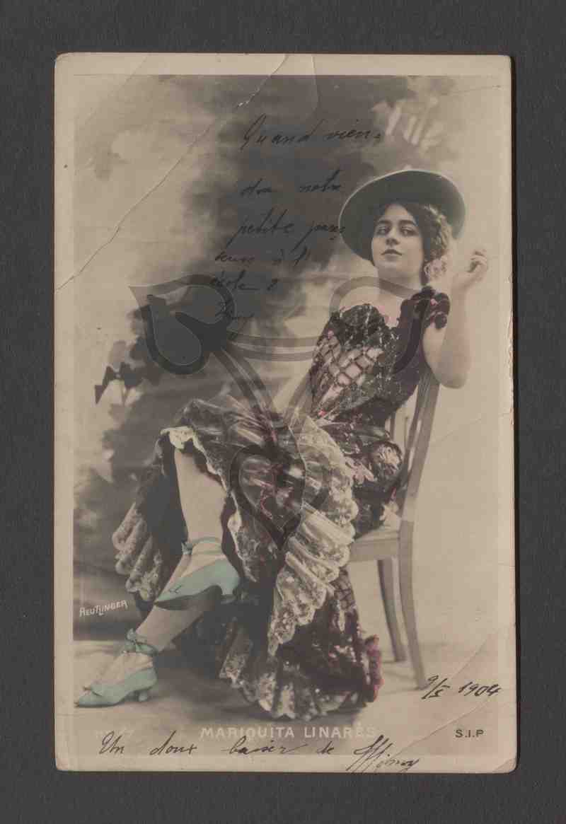 Studioaufnahme, neutraler Hintergrund. Die junge Frau, bekleidet mit einem Varieté-Kostüm, sitzt auf einem Stuhl. In der unteren linken Ecke die Aufschrift „Reutlinger“ und weiter unten „119/7“, in der unteren rechten Ecke das Signet des Verlages: S.I.P.