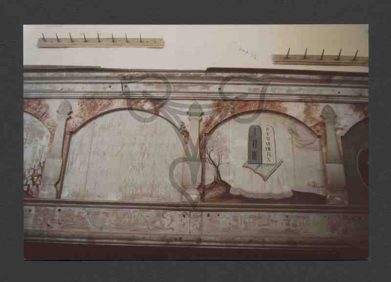 Rahmenkonstruktion; Füllungen, Rahmen und Gelände bemalt. Auf dem unteren Rahmenfries neben floralen Motiven Schriftzeichen, darüber auf den Rahmen hölzerne Pliaster, ebenfalls bemalt, darüber Handlauf. Über dem Geländer zwei längere Kleiderhaken. Die Linke Füllungen enthält eine verblichene Schrift, die Rechte die Darstellung der beiden Gesetzestafeln des Moses.